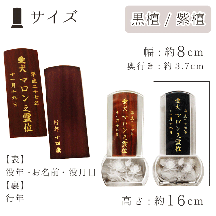 ●本体サイズ 本体サイズ:幅8cm×高さ16cm×奥3.7cm 位牌札サイズ:幅約4.3cm×高さ約11cm 納期につきましては、原稿ご確定後より約2週間前後です。